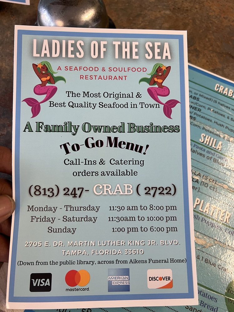 Introducing the menu at Ladies of the Sea & Soulfood, a hidden gem in Tampa offering delightful soul food and fresh seafood dishes. Located at 2705 E Dr Martin Luther King Jr Blvd, this cozy spot is perfect for groups and families alike. Customers rave about the generous portions and friendly service, with standout dishes like oxtail, turkey wings, meatloaf, and fried chicken receiving high praise. The menu boasts classic comfort foods like collard greens, mac and cheese, yams, and cornbread, all expertly prepared with flavorful seasonings. Dessert options like banana pudding and blue velvet cake are also not to be missed. Don't forget to try their specialty drinks and happy hour specials for a truly satisfying dining experience. Visit Ladies of the Sea & Soulfood for a taste of homemade goodness and warm hospitality.